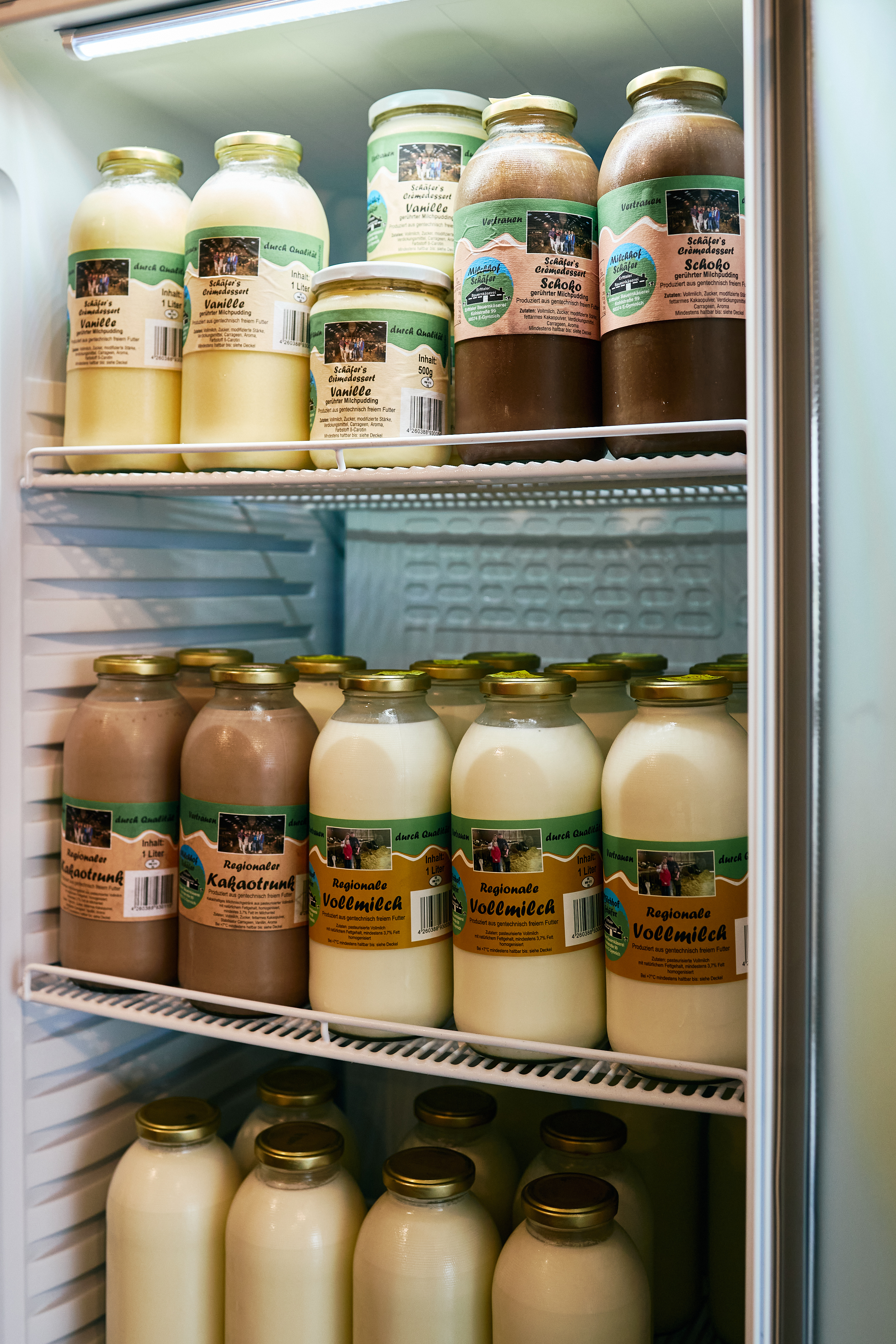 Unsere Milch stammt ausschließlich von unseren eigenen Kühen und wird direkt bei uns vor Ort schonend pasteurisiert und weiterverarbeitet. So bleibt der natürliche Geschmack erhalten – genau so, wie man ihn sich von echter Hofmilch wünscht.